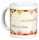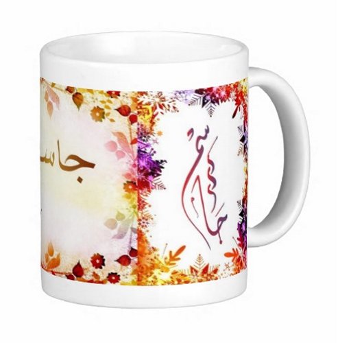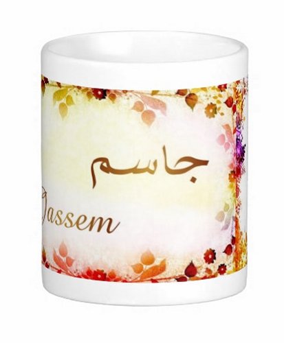 Mug avec le prénom "Jassem" écrit en français, en arabe (جاسم) et calligraphié de façon artistique en arabe sur la partie droite.