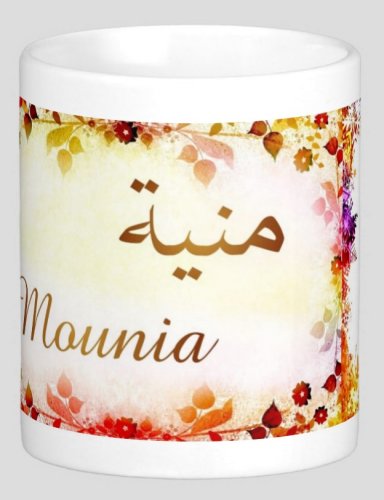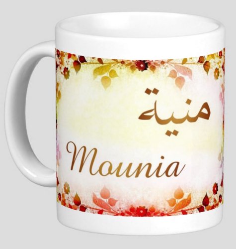 Mug avec le prénom "Mounia" écrit en français, en arabe (منية) et calligraphié de façon artistique en arabe sur la partie droite.