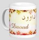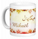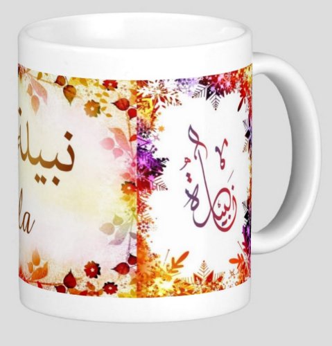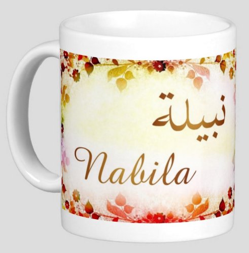 Mug avec le prénom "Nabila" écrit en français, en arabe (نبيلة) et calligraphié de façon artistique en arabe sur la partie droite.