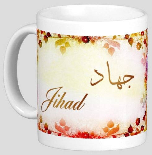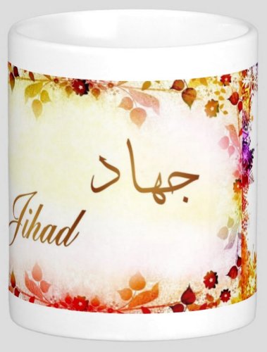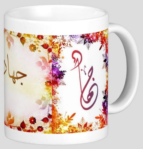 Mug avec le prénom "Jihad" écrit en français, en arabe (جهاد) et calligraphié de façon artistique en arabe sur la partie droite.