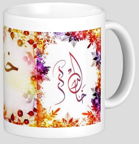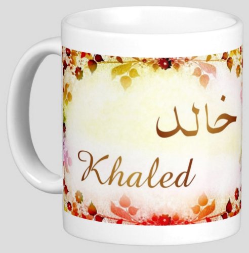 Mug avec le prénom "Khaled" écrit en français, en arabe (خالد) et calligraphié de façon artistique en arabe sur la partie droite.