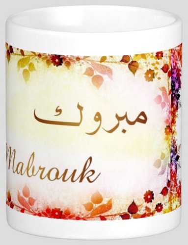 Mug avec le prénom "Mabrouk" écrit en français, en arabe (مبروك) et calligraphié de façon artistique en arabe sur la partie droite.