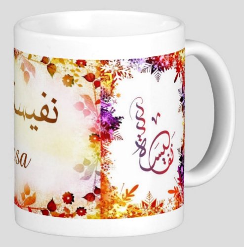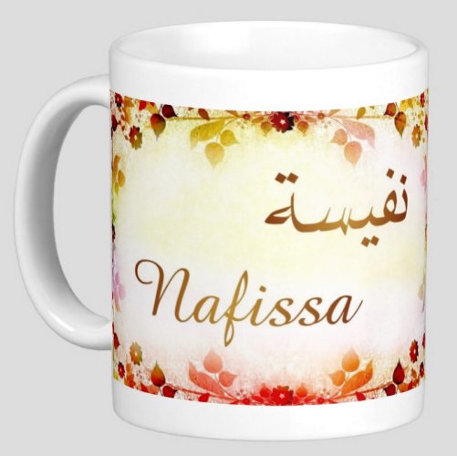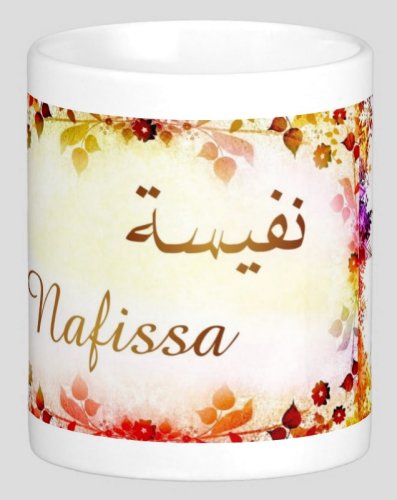 Mug avec le prénom "Nafissa" écrit en français, en arabe (نفيسة) et calligraphié de façon artistique en arabe sur la partie droite.