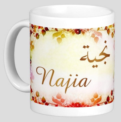 Mug avec le prénom "Najia" écrit en français, en arabe (نجية) et calligraphié de façon artistique en arabe sur la partie droite.