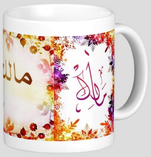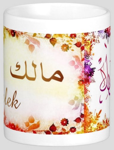 Mug avec le prénom "Malek" écrit en français, en arabe (مالك) et calligraphié de façon artistique en arabe sur la partie droite.