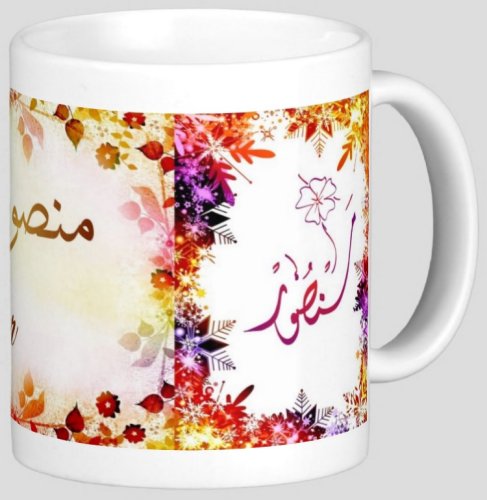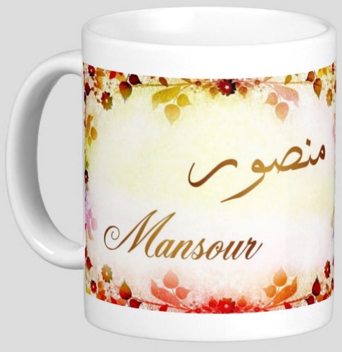 Mug avec le prénom "Mansour" écrit en français, en arabe (منصور) et calligraphié de façon artistique en arabe sur la partie droite.