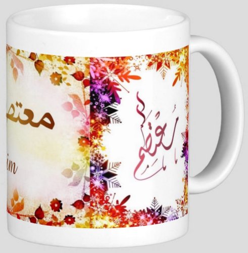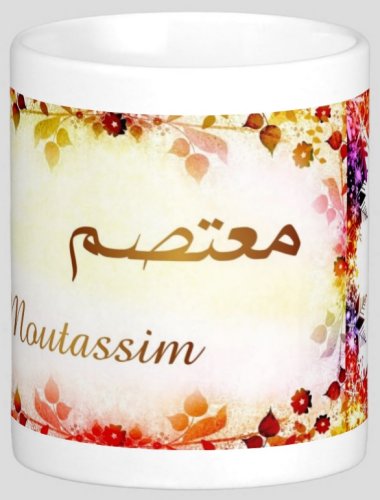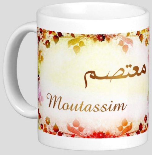 Mug avec le prénom "Moutassime" écrit en français, en arabe (معتصم) et calligraphié de façon artistique en arabe sur la partie droite.