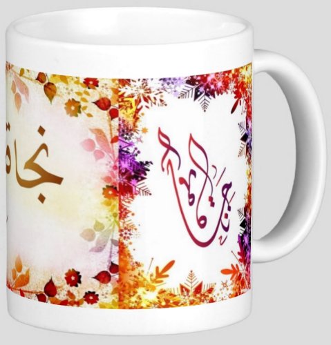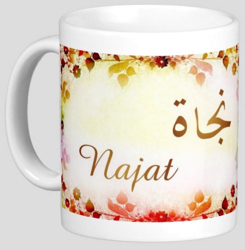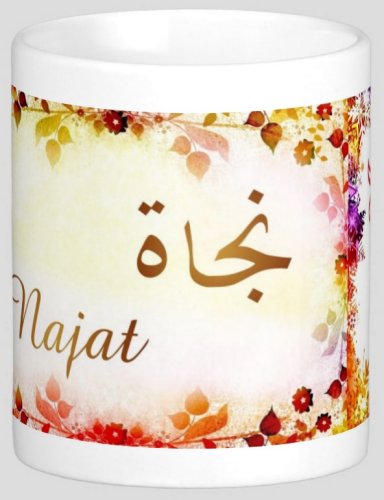 Mug avec le prénom "Najat" écrit en français, en arabe (نجاة) et calligraphié de façon artistique en arabe sur la partie droite.