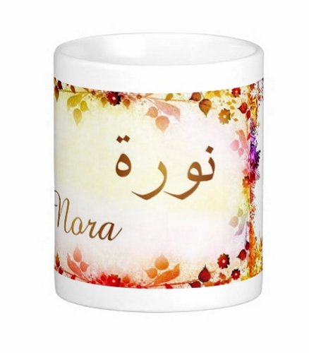Mug avec le prénom "Nora" écrit en français, en arabe (نورة) et calligraphié de façon artistique en arabe sur la partie droite.
