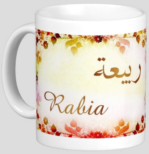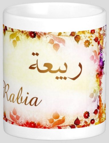 Mug avec le prénom "Rabia" écrit en français, en arabe (ربيعة) et calligraphié de façon artistique en arabe sur la partie droite.
