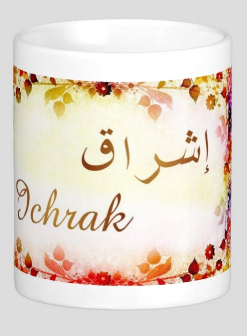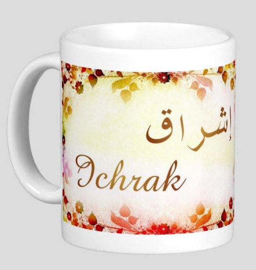 Mug avec le prénom "Ichrak" écrit en français, en arabe (إشراق) et calligraphié de façon artistique en arabe sur la partie droite.