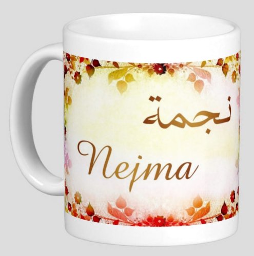 Mug avec le prénom "Nejma" écrit en français, en arabe (نجمة) et calligraphié de façon artistique en arabe sur la partie droite.