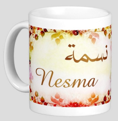 Mug avec le prénom "Nesma" écrit en français, en arabe (نسمة) et calligraphié de façon artistique en arabe sur la partie droite.