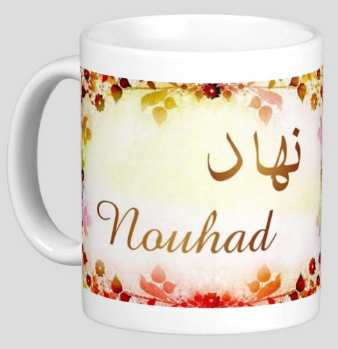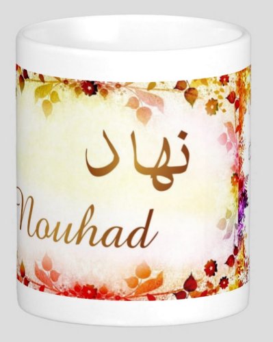 Mug avec le prénom "Nouhad" écrit en français, en arabe (نهاد) et calligraphié de façon artistique en arabe sur la partie droite.