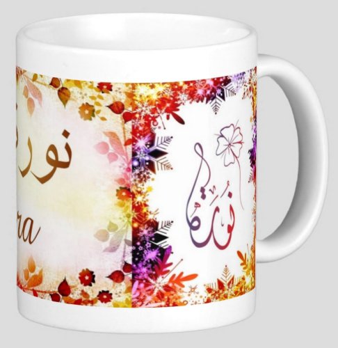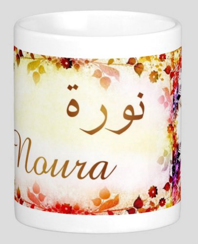 Mug avec le prénom "Noura" écrit en français, en arabe (نورة) et calligraphié de façon artistique en arabe sur la partie droite.
