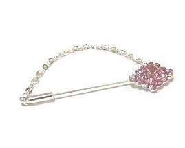 Epingle à broche pour Hijâb en métal argenté, sertie de pierres cristallines en forme de losange, et de couleur rose.