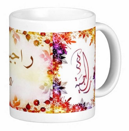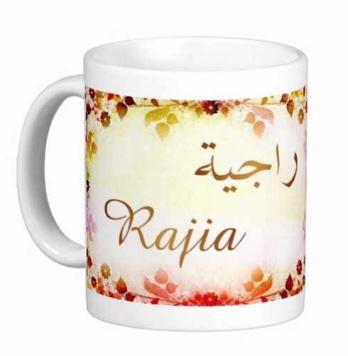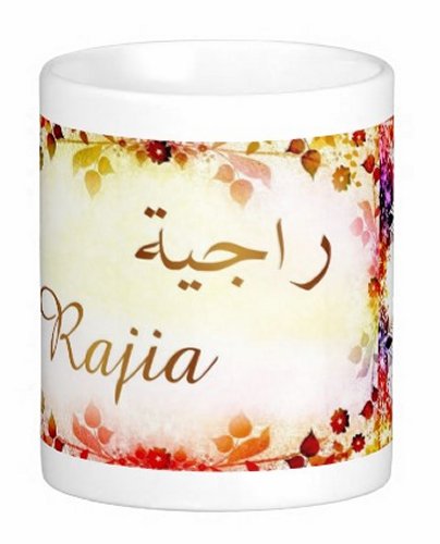 Mug avec le prénom "Rajia" écrit en français, en arabe (راجية) et calligraphié de façon artistique en arabe sur la partie droite.