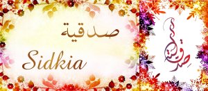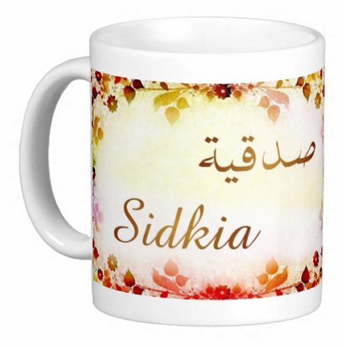Mug avec le prénom "Sidkia" écrit en français, en arabe (صدقية) et calligraphié de façon artistique en arabe sur la partie droite.