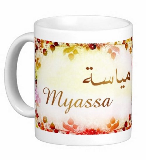 Mug avec le prénom "Myassa" écrit en français, en arabe (مياسة) et calligraphié de façon artistique en arabe sur la partie droite.