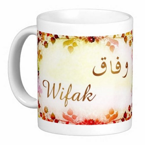 Mug avec le prénom "Wifak" écrit en français, en arabe (وفاق) et calligraphié de façon artistique en arabe sur la partie droite.
