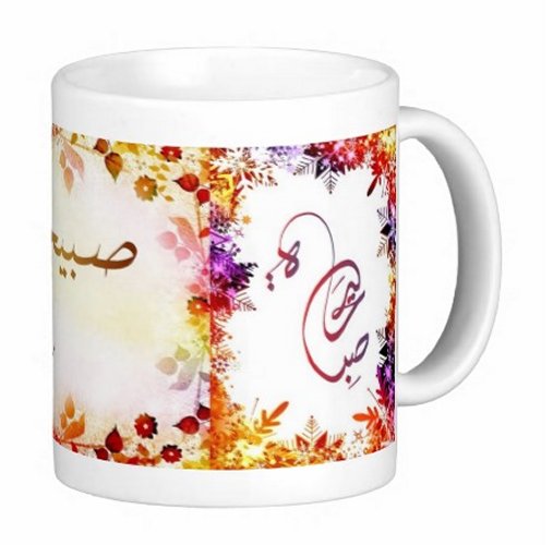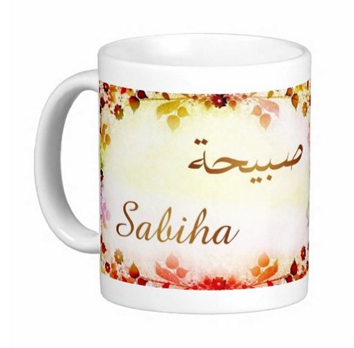 Mug avec le prénom "Sabiha" écrit en français, en arabe (صبيحة) et calligraphié de façon artistique en arabe sur la partie droite.