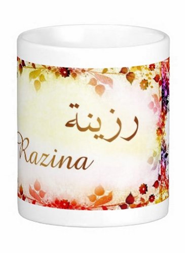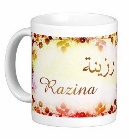 Mug avec le prénom "Razina" écrit en français, en arabe (رزينة) et calligraphié de façon artistique en arabe sur la partie droite.