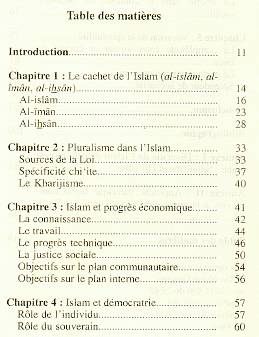 Il expose tout d'abord les cinq piliers de l'Islam qui forgent la foi de tout musulman. Il aborde brièvement les sources de la loi musulmane, ou chari'a. Il explique comment l'Islam promeut le progrès économique avec une exigence : la justice sociale.Il rappelle le rôle et l'importance de la femme dans la société. Enfin, après ces sujets d'ordre matériel, il souligne la profondeur de la spiritualité en Islam.