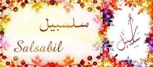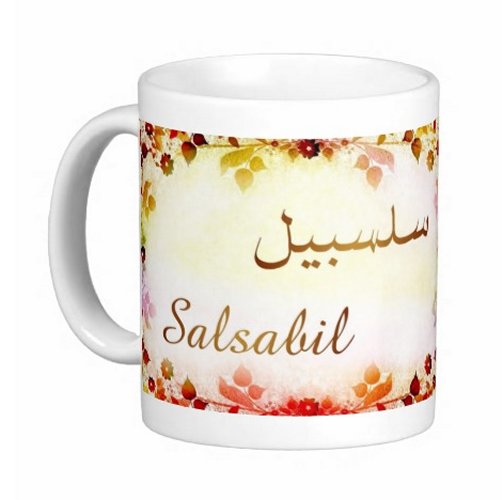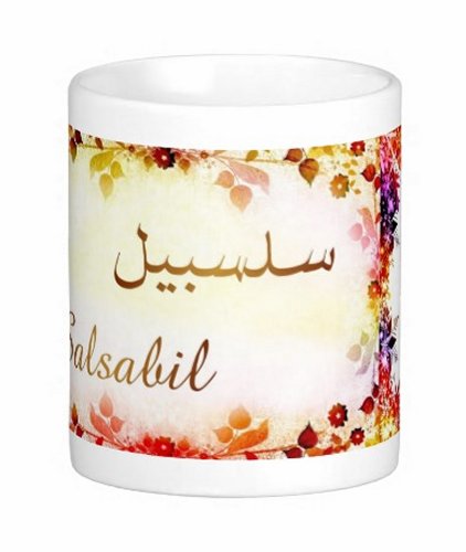 Mug avec le prénom "Salsabil" écrit en français, en arabe (سلسبيل) et calligraphié de façon artistique en arabe sur la partie droite.