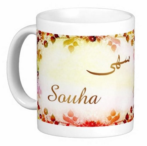 Mug avec le prénom "Souha" écrit en français, en arabe (سهى) et calligraphié de façon artistique en arabe sur la partie droite.