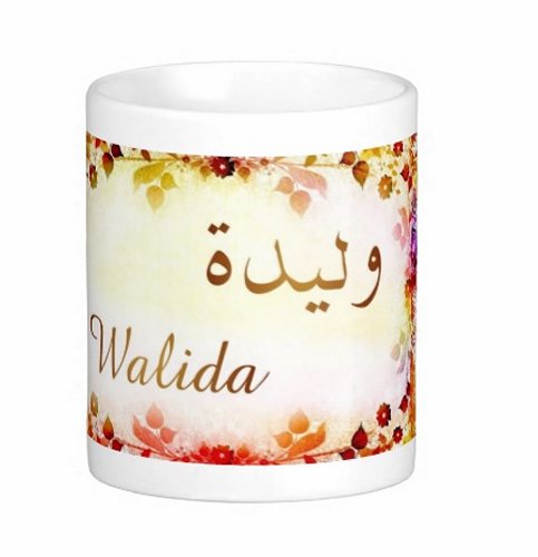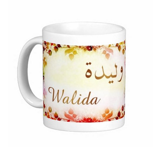 Mug avec le prénom "Walida" écrit en français, en arabe (وليدة) et calligraphié de façon artistique en arabe sur la partie droite.