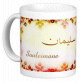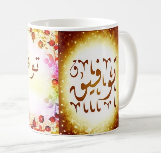 Mug avec le prénom "Taoufik" écrit en français, en arabe (توفيق) et calligraphié de façon artistique en arabe sur la partie droite.