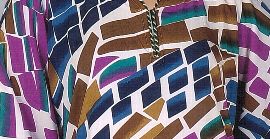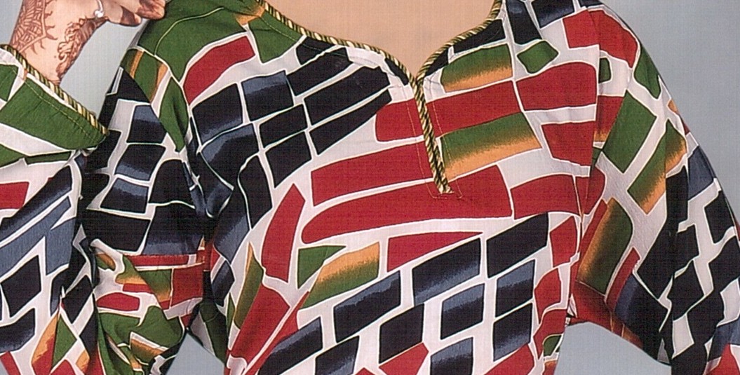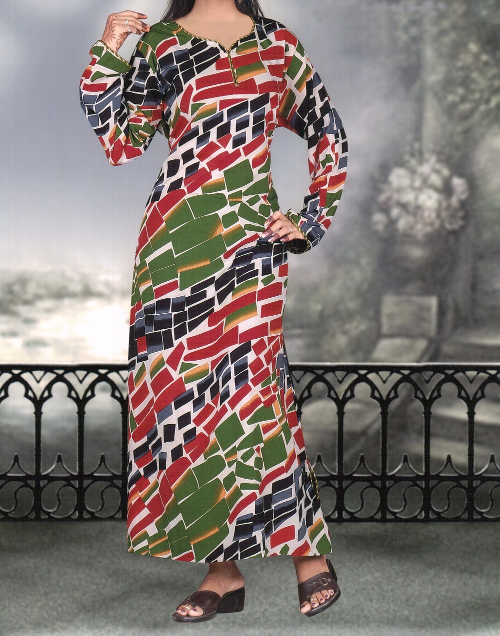 Robe d’intérieur orientale avec motifs couleurs et fermeture scratch au niveau de la poitrine.