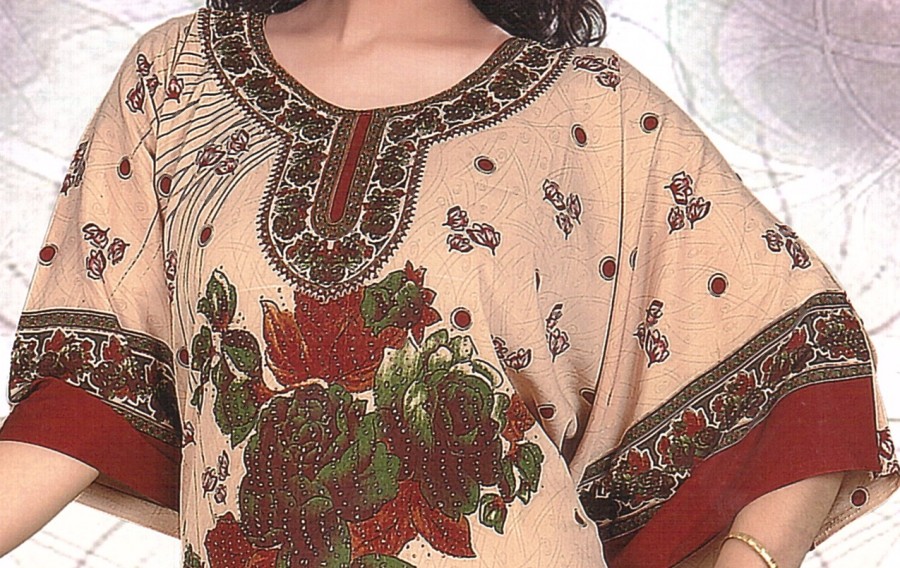 Très jolies robes d'intérieur. Tissus légers, doux et agréables à mettre. Idéal pour la maison ou pour l'été. Les robes sont généralement ornées de paillettes brillantes et accompagnées d'un grand foulard rectangulaire assorti (écharpe d'environ 2 mètres sur 1 mètre). Fabrication indienne.