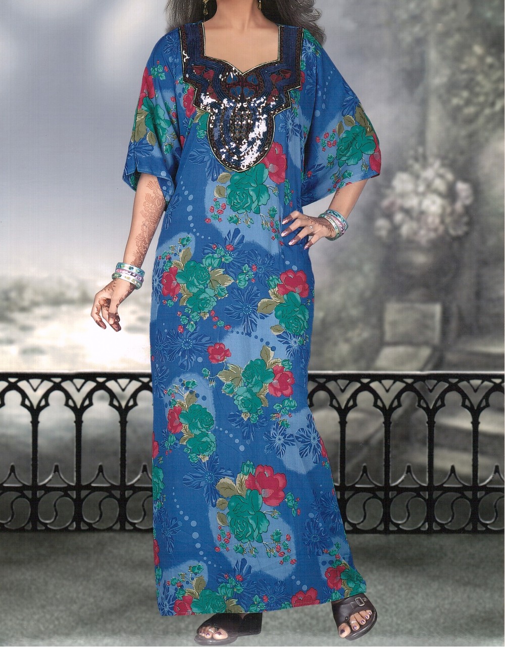 Robe orientale d'été fleurie avec col trapèze et longueurs brodés - REF. 20916 (19.90 €)