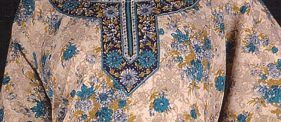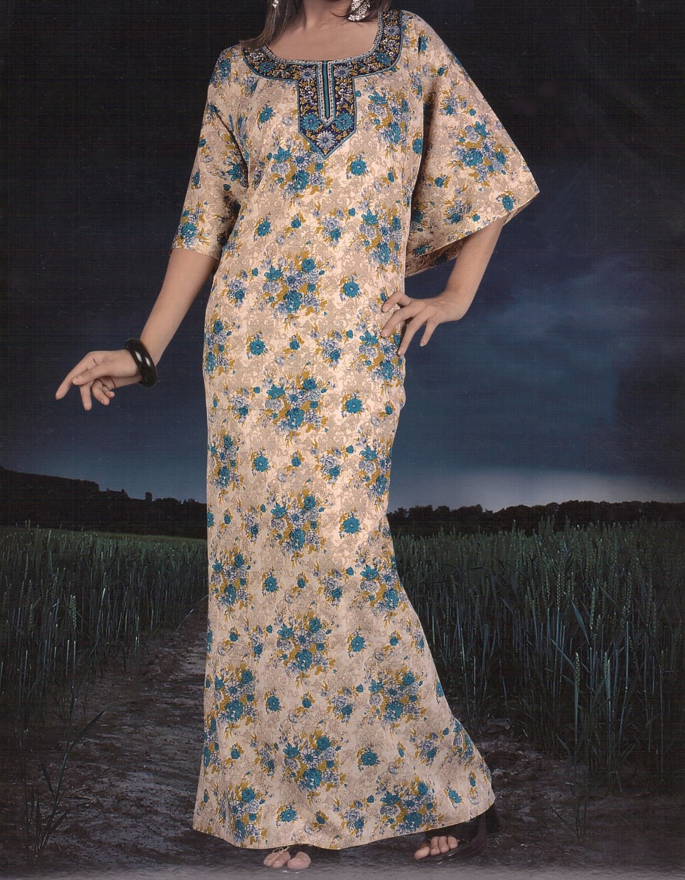 Robe orientale avec motifs fleurs. Manches courtes.