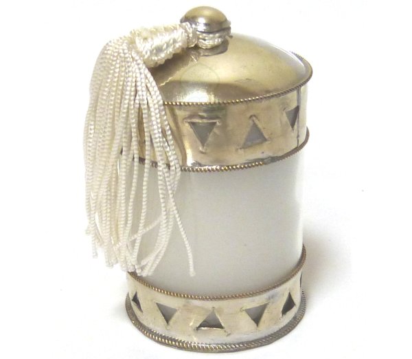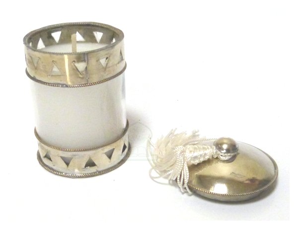 Photophore / Bougeoir en verre avec bougie cercle de metal argente cisele termine d'un pompon en Sabra - Modele blanc
