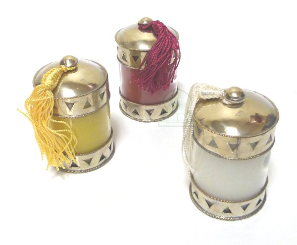 Photophore / Bougeoir en verre avec bougie cerclé de métal argenté ciselé terminé d'un pompon en Sabra - - REF. 16857 (9.90 €)