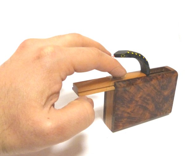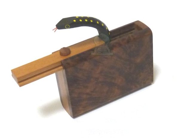 Amusante qu'est cette surprise, une jolie boîte artisanale en bois de thuya, en provenance de Marrakech... Cette boîte s'ouvre pour qu'un amusant serpent en bois, à l'allure d'un vrai serpent sort pour vous chatouiller !