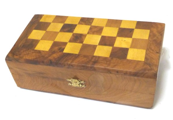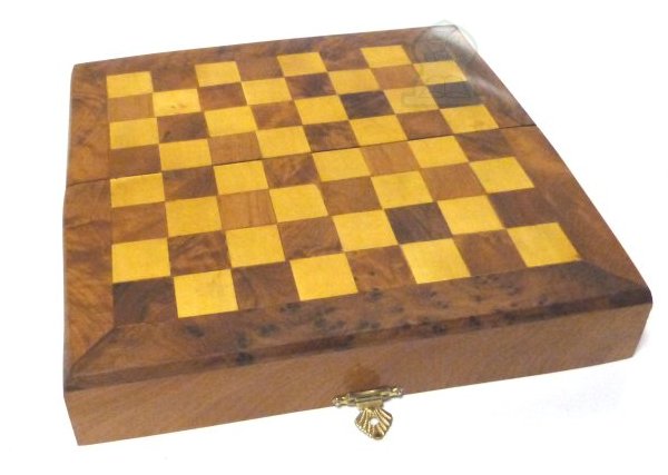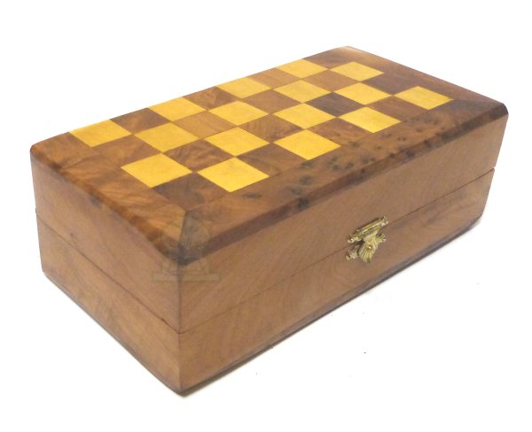 Boîte de jeu d'échecs artisanale, fabriquée en bois de thuya, en provenance du Maroc, pouvant se fermer pour contenir toutes les pièces de jeu...