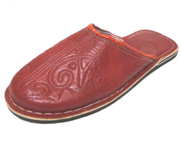 Jolie babouche marocaine, entièrement fait mains, fabriquée en cuir rouge - composition cuir - ; elle possède un extrémité arrondie et est décorée de motifs cousus à même le cuir...