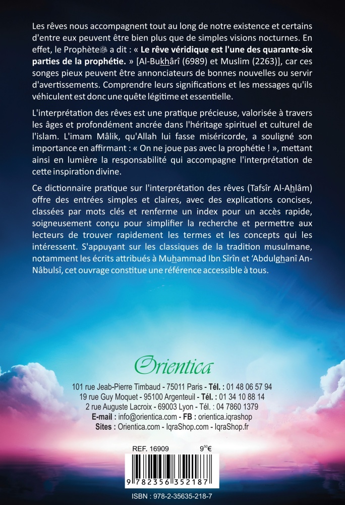 Ce dictionnaire pratique sur l'interprétation des rêves (Tafsîr Al-Ahlâm) offre des entrées simples et claires, avec des explications concises, classées par mots clés et renferme un index pour un accès rapide, soigneusement conçu pour simplifier la recherche et permettre aux lecteurs de trouver rapidement les termes et les concepts qui les intéressent. S'appuyant sur les classiques de la tradition musulmane, notamment les écrits attribués à Muhammad Ibn Sîrîn et ‘Abdulghanî An-Nâbulsî, cet ouvrage constitue une référence accessible à tous.