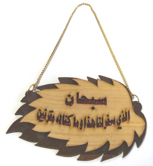 Pendentif à accrocher dans la voiture sous forme d'une feuille d'arbre en bois sculpté à l'intérieur en arabe l'Invocation du voyage (Du'a' As-Safar).
