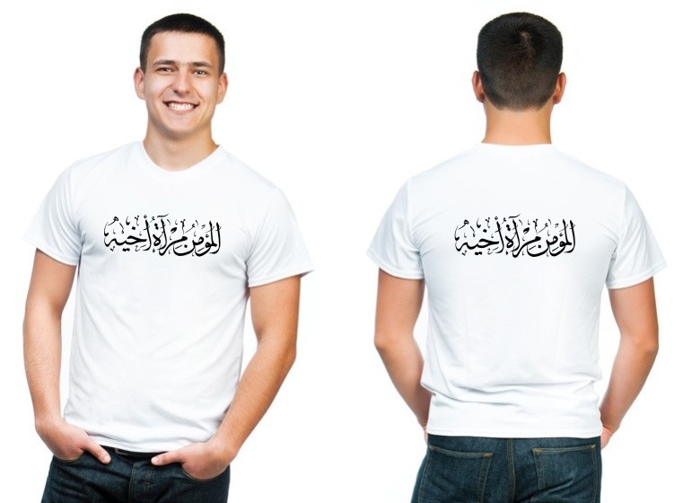 T-Shirt avec très jolie calligraphie artistique المؤمن مرآة أخيه (Le croyant est le miroir de son frère). Cette sagesse s'inspire d'un hadith prophétique qui a un sens équivalent. En effet le prophète de l'Islam (SAW) dit dans un hadith authentique : « Le croyant est le miroir du croyant et le croyant est le frère du croyant. Il protège ce qu'il risque de perdre et le préserve en son absence ». (Rapporté par Abou Daoud dans ses Sunan - hadith n°4918 et authentifié par cheikh Albani).
