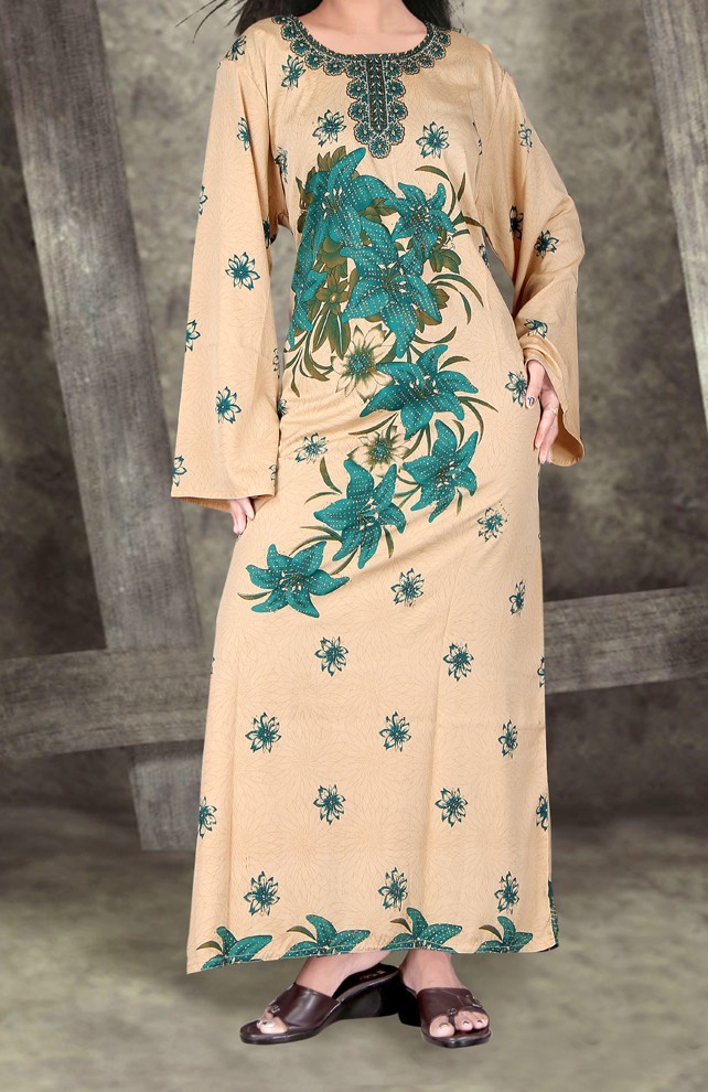 Robe orientale avec motifs. Manches longues et grand châle assorti.