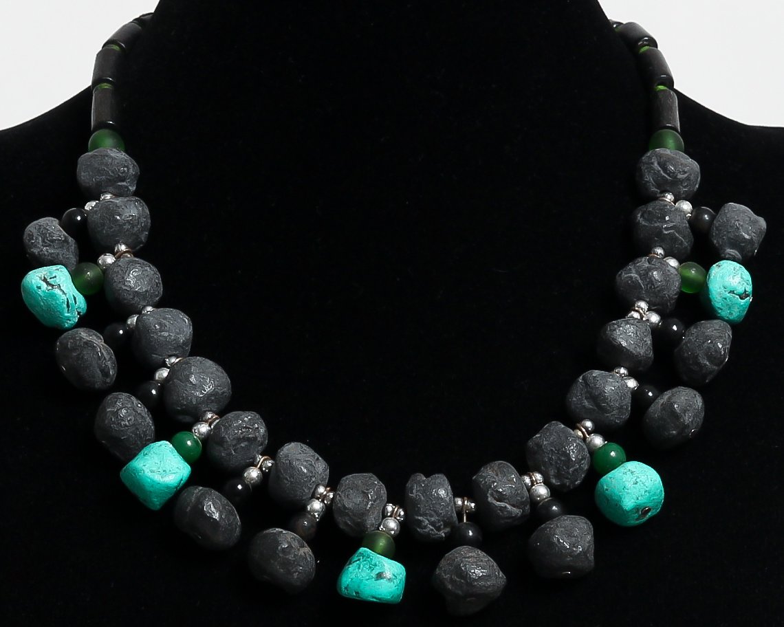 Collier ethnique artisanal imitation pierres noires et vertes agencees de perles et agremente de pieces en metal argente