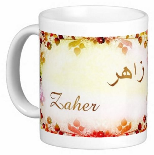 Mug avec le prénom "Zaher" écrit en français, en arabe (زاهر) et calligraphié de façon artistique en arabe sur la partie droite.
