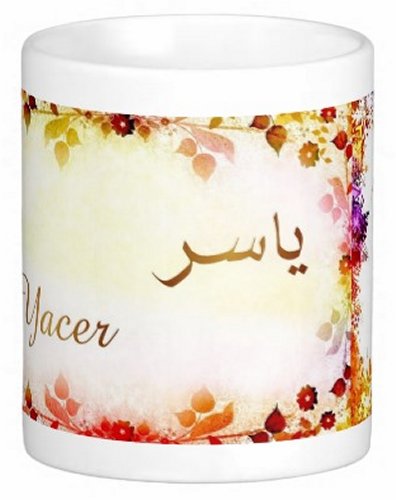 Mug avec le prénom "Yacer" écrit en français, en arabe (ياسر) et calligraphié de façon artistique en arabe sur la partie droite.