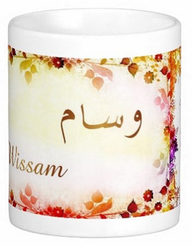 Mug avec le prénom "Wissam" écrit en français, en arabe (وسام) et calligraphié de façon artistique en arabe sur la partie droite.