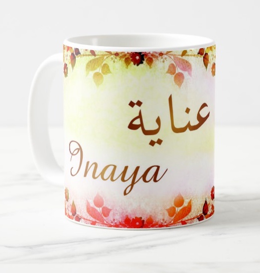 Mug avec le prénom Inaya calligraphié en arabe ainsi que son écriture normale en arabe (عناية) et en français.