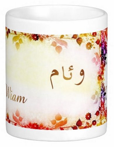Mug avec le prénom "Wiam" écrit en français, en arabe (وئام) et calligraphié de façon artistique en arabe sur la partie droite.